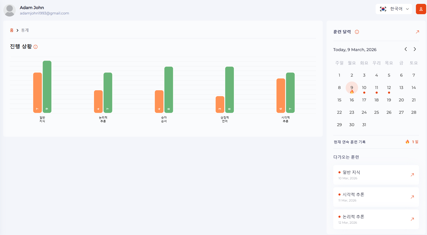IQ 부스터를 사용하면 다양한 인지 영역에서 진행 상황을 추적할 수 있습니다. 이 플랫폼은 여러분의 현재 위치를 정확히 보여주고, 강점과 약점을 강조하며, 개선이 필요한 영역을 식별하는 데 도움을 줍니다. 이를 통해 훈련을 개인화하고 가장 중요한 기술에 집중할 수 있습니다.