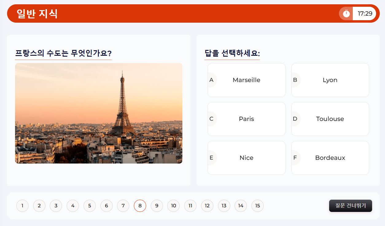 역사, 지리, 과학, 예술, 문학, 대중 문화 등 다양한 주제에 대한 일반 지식을 테스트해 보세요.