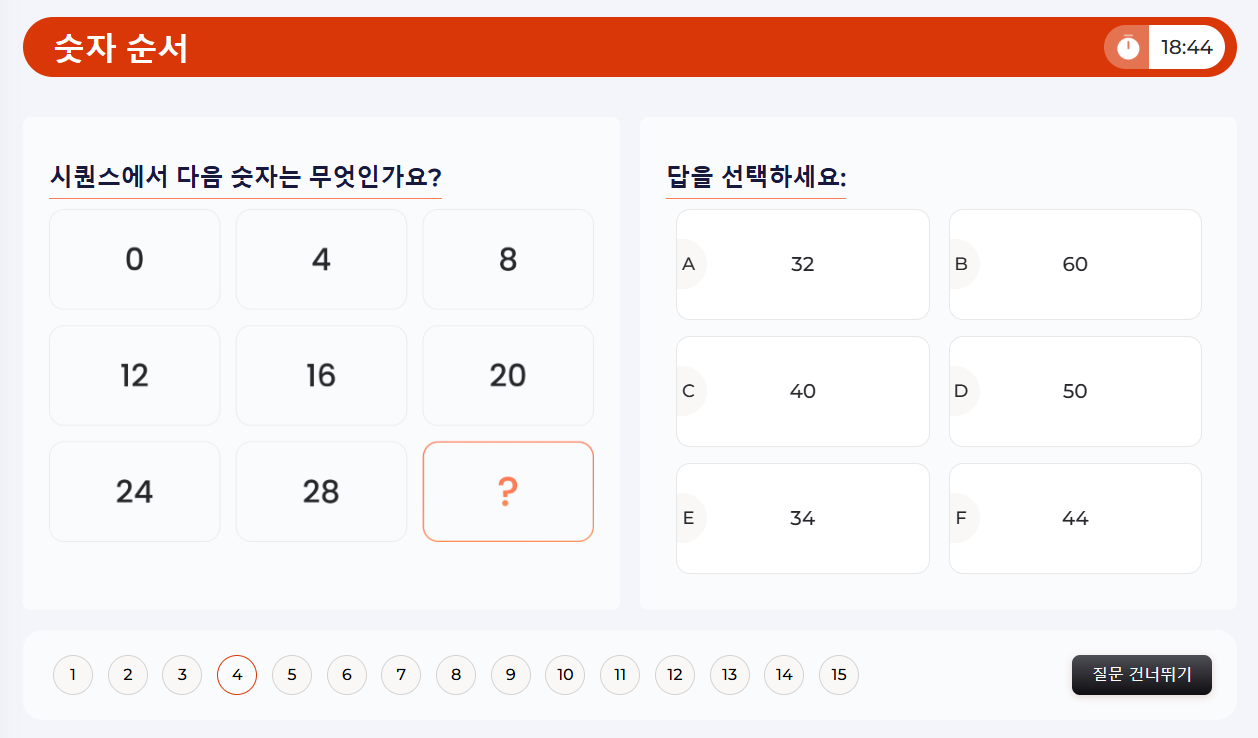 숫자 순서 문제를 통해 숫자 순서의 패턴을 식별하고 예측하는 능력을 테스트해 보세요. 이 작업에는 빠진 숫자를 찾는 것, 순서에서 다음 숫자를 결정하는 것, 기본 규칙을 식별하는 것 등이 포함될 수 있습니다.