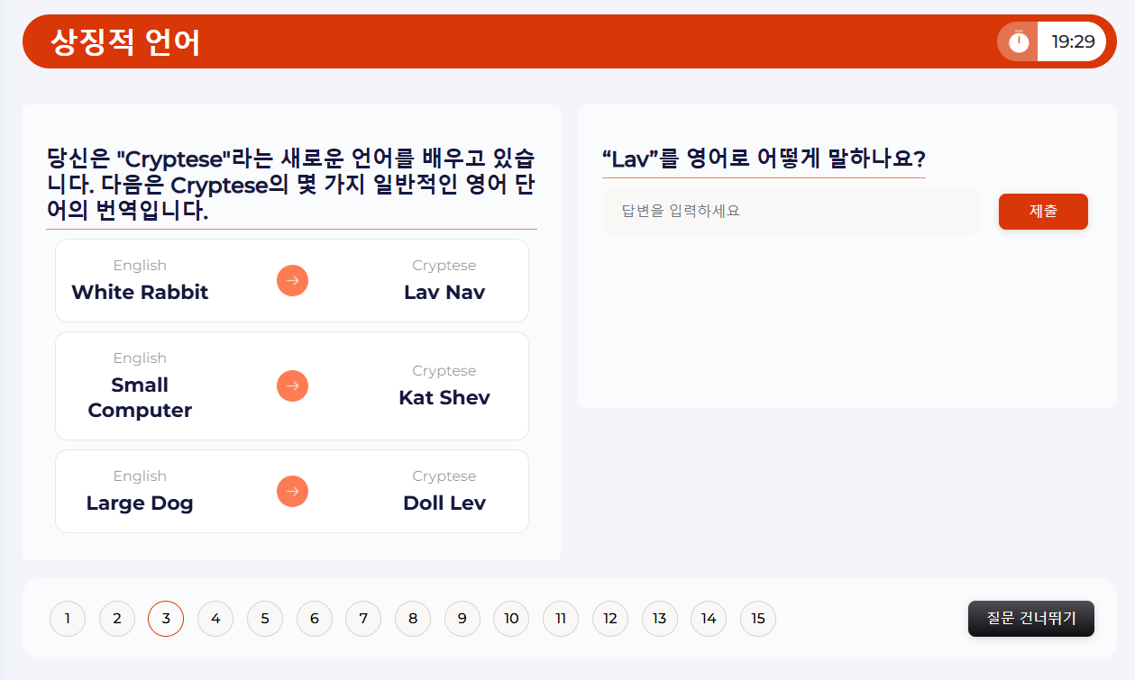 상징적 언어 질문은 대상, 개념, 또는 아이디어 사이의 관계를 상징적으로 표현하는 것을 포함합니다. 서로 다른 여러 열의 겹치는 상징적 “사전”에서 번역 단어를 찾아보세요.